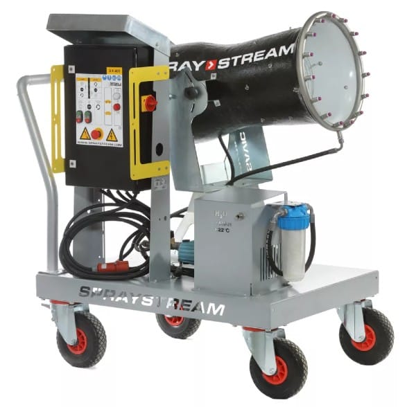 SPRAYSTREAM 10 er en let bærbar støvdæmpningsmaskine, der genererer en ensartet strøm af mikrodråber at til at opfange luftbårne støvpartikler og forhindre udspil af diffust støv.