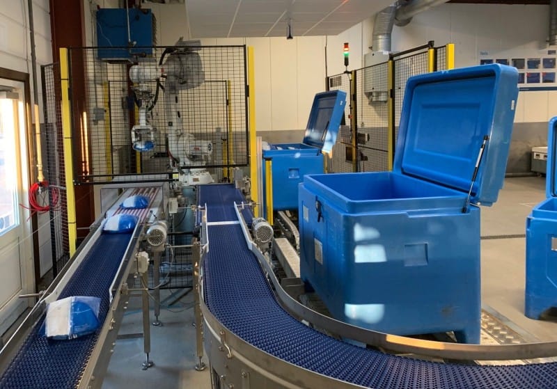 Eller den specialbyggede griber, der sikrer, at der ikke går hul på poserne med tøris fra Linde under pakning. Det forebygger på en gang arbejdsulykker og at kunden modtager en tom pose. Tøris smelter nemlig ved at blive til gas, der forsvinder op i den blå luft.