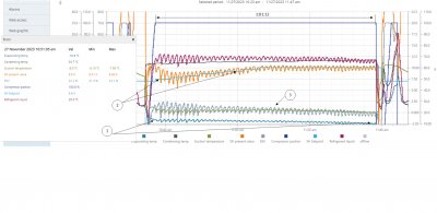 Dataregistrering og -analyse for kredsløbet med den magnetiske MVL702-ekspansionsventil, som har et helt andet driftsprincip end en stepventil, er vist til sammenligning nedenfor: