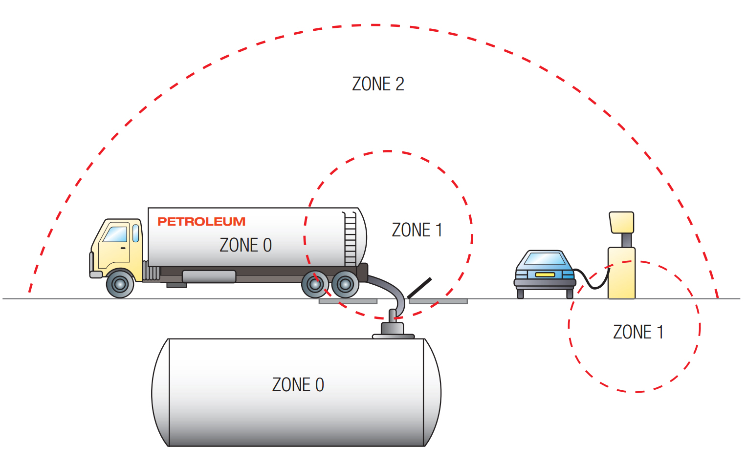 - Zone 0 – Et område hvor eksplosiv gas / luftblanding er til stede kontinuerligt eller i lange perioder.