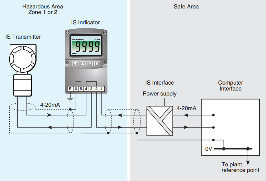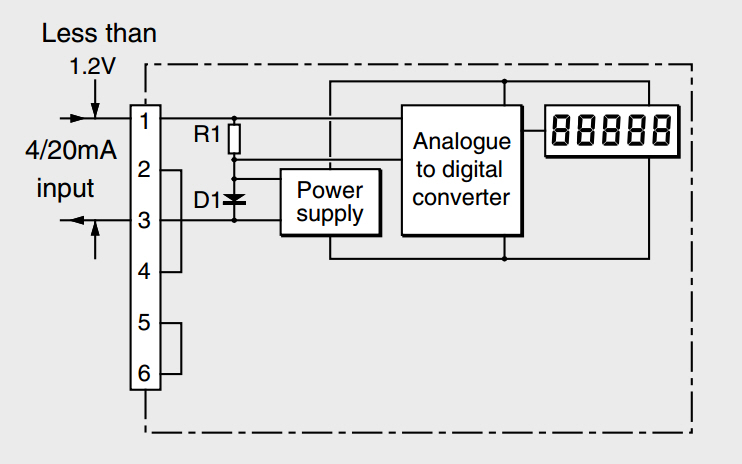 Strømsignalet på 4…20mA løber igennem modstanden R1 og diode D1. Spændingen over D1 benyttes til at drive en switch-mode strømforsyning for forsyning af instrumentet, mens spændingsfaldet over modstanden R1 giver indgangssignalet til A/D konverteren som angiver måleværdien på skærmen. Den store udfordring i denne indikatortype er at producere en nøjagtig måling som mulig, samtidig med der mistes så lidt af den til rådighed værende spænding som muligt. Udover forsyning af displayenheden kan indikatorerne også indeholde baggrundsbelysning og alarmfaciliteter – alt sammen funktioner der skal forsynes via strømsløjfens 4 mA.