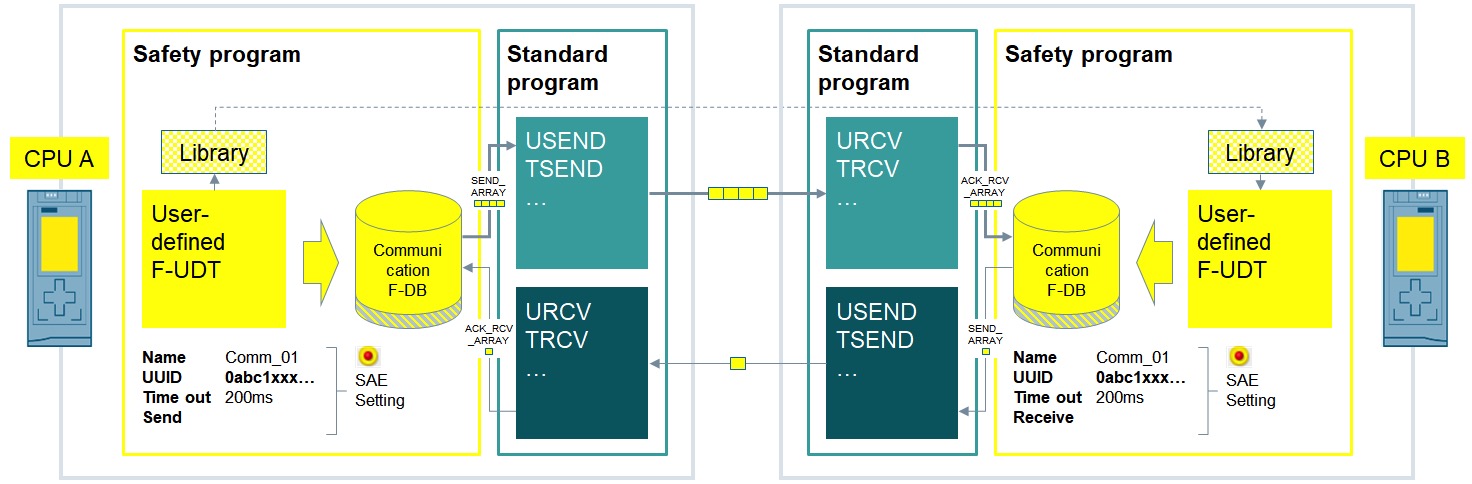 Det sker ofte, at det bliver fast fortrådet signaler, som medfører brug af relæer for galvanisk adskillelse. Hidtil har det på S7-1200 og S7-1500F været muligt at bruge en PN/ PN-kobler eller I-Device-kommunikation til at overføre sikre signaler. Men nu kan du via Open User-kommunikation sende safety signaler mellem controllere, der sidder i forskellige netværk.