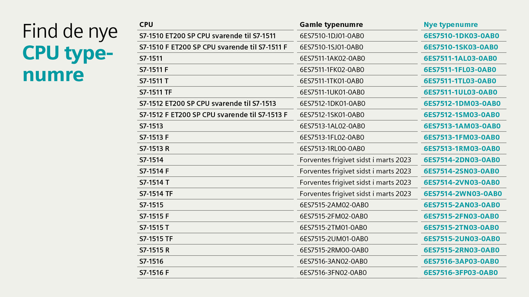 SIMATIC S7-1511 til og med S7-1516 får nye typenumre