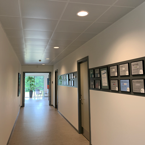 Til disse downlights er der tilkoblet sensor, som sikrer at gangene kun er oplyst, når der er bevægelse. Dermed undgår man også, at lyset brænder unødvendigt, når gangene ikke benyttes.