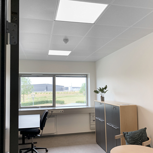 I de mange kontorlokaler blev de eksisterende lyskilder udskiftet med Pragmalux LED 60×60 paneler. Panelerne giver et godt og flimmerfrit arbejdslys med en lysfarve på 4.000 kelvin, som er lysfarven ved dagslys. Panelet har en prismatisk overflade for lav blænde på UGR<19.