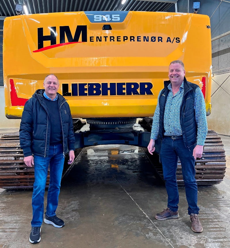 “Ja, tak. Så gerne”, sagde Johs. Møllers Maskiners direktør, Leif Rudebeck Petersen (til venstre), da indehaveren af HM Entreprenør A/S, Michael Mortensen, bestilte 54 Liebherr-maskiner og dermed sikrede en ny rekord til den danske Liebherr-importør.