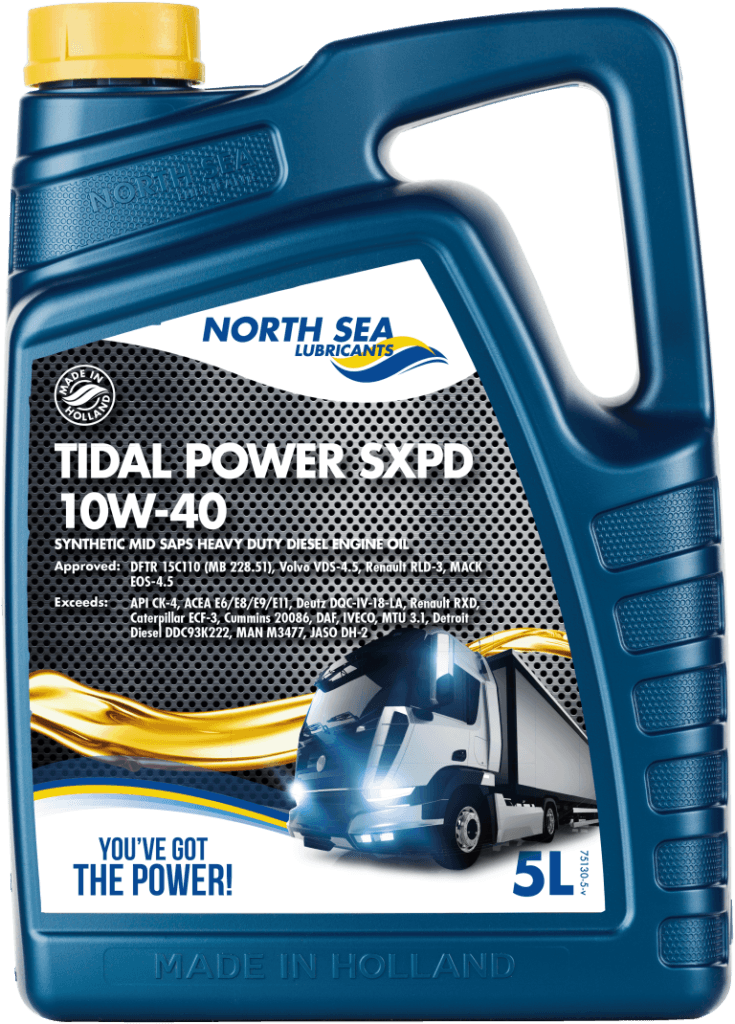 TIDAL POWER SXPD SERIEN er en brændstofbesparende super MID SAPS højtydende universalolie designet til højt belastede dieselmotorer i lette og tunge erhvervskøretøjer, der arbejder under krævende driftsforhold hele året og kører på lavsvovlet dieselbrændstof (maks. 50 ppm), til brug i Euro-4, Euro-5 og Euro-6 motorer udstyret med dieselpartikelfilter (DPF). Dette produkt er også egnet til køretøjer udstyret med EGR- og/eller SCR-efterbehandlingssystemer.